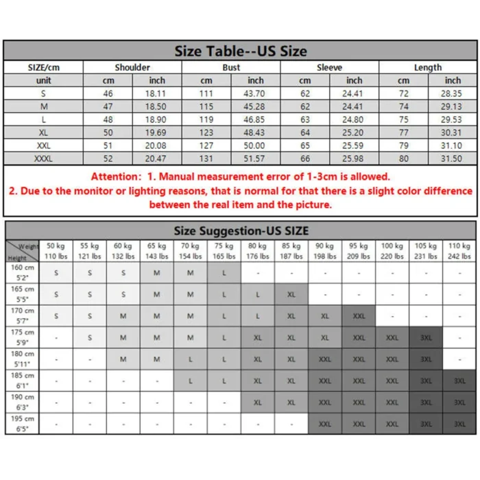 US S 50-60 KG, US M 60-70 KG, US L 70-80 KG, US XL 80-90 KG, US XXL 90-100 KG, US 3XL 100-110KG