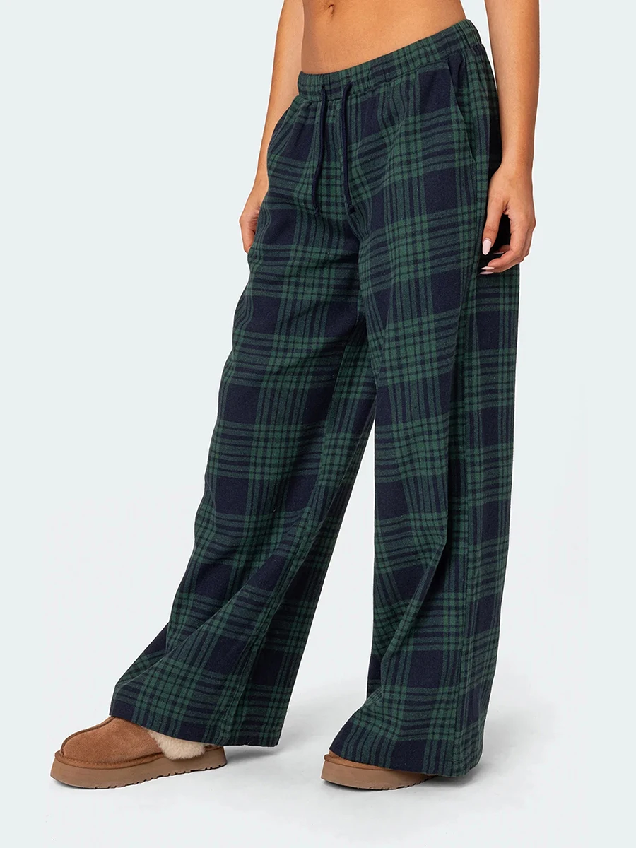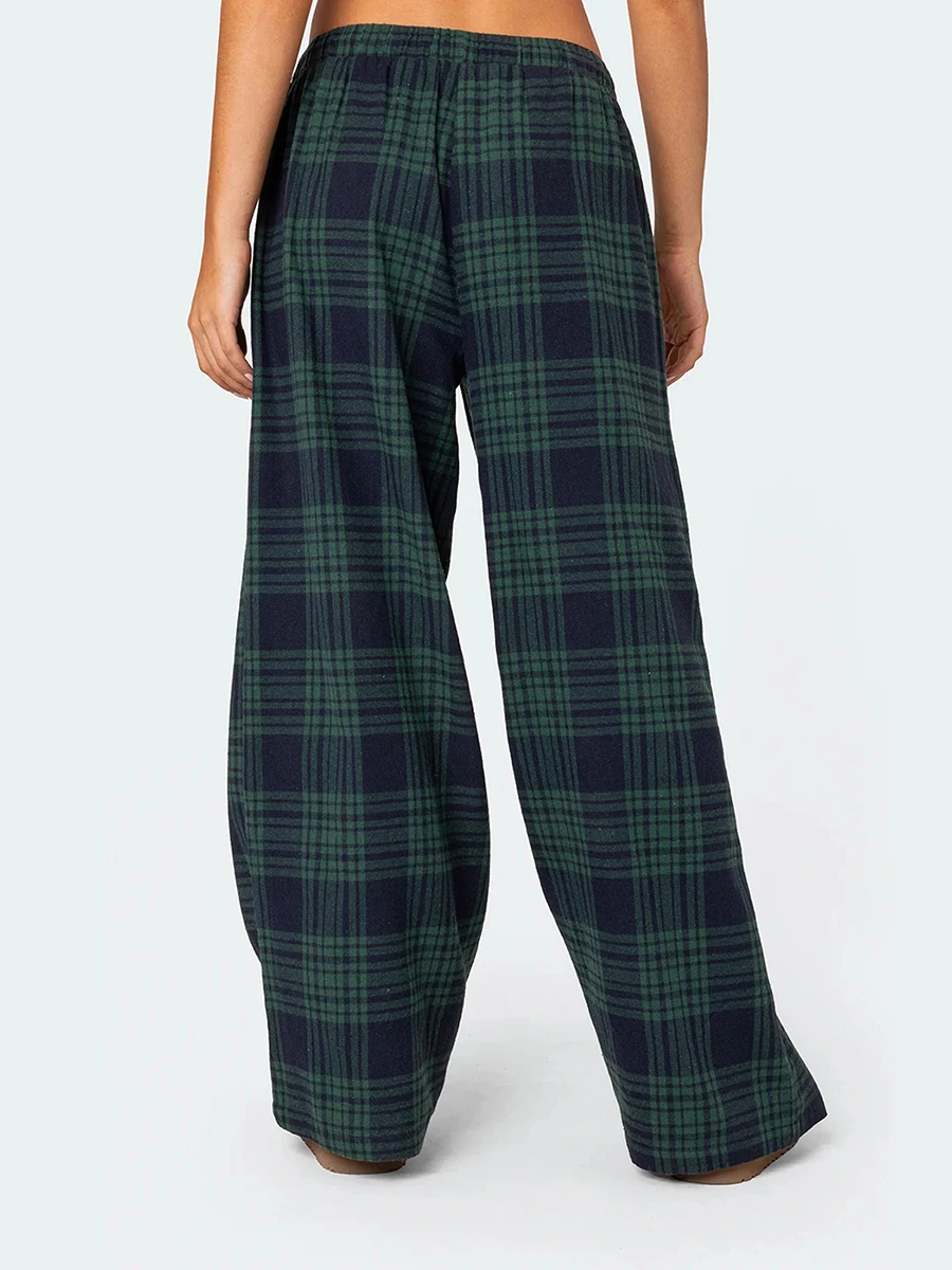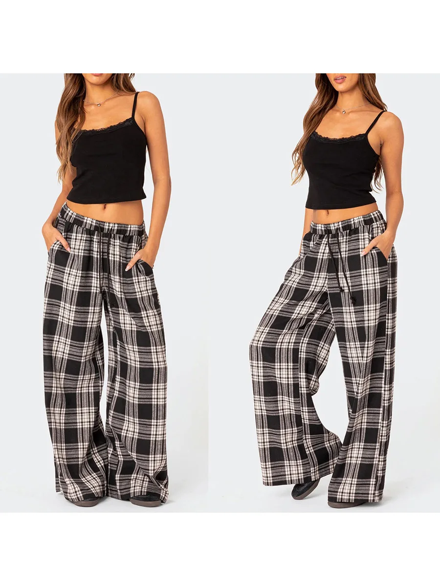 Women’s Casual Trousers Classic Plaid Print Elastic Waist Loose Wide Leg Pants Lounge Pants