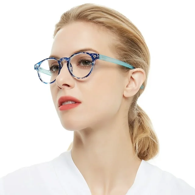 - Lightwieght & Comfortable Fit:Â Well made spectacle frame weighs only 14g, greatly reducing the pressure of glasses on the nose and ears. Lightweight round readers 4.0 will not leave red marks on your face. Elastic spring hinge makes the blue readers fit your face better, no clipping your cheek and ears. Ergonomic nose pads and temples are designed to make the glasses less likely to fall off when you are looking down or exercising.