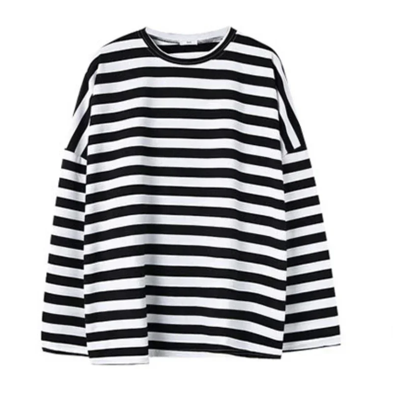 Spring Autumn Women Harajuku Striped T Shirt Long Sleeve O-Neck T-Shirts Korean Casual Oversized T Shirt Femme Black Tops